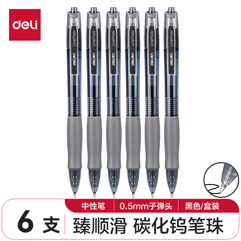 自营 得力(deli)【顺滑之星】臻顺滑办公中性笔 签字笔 0.5mm子弹头按动笔水笔 办公用品 黑色 6支/盒S08-6¥12.42热销中