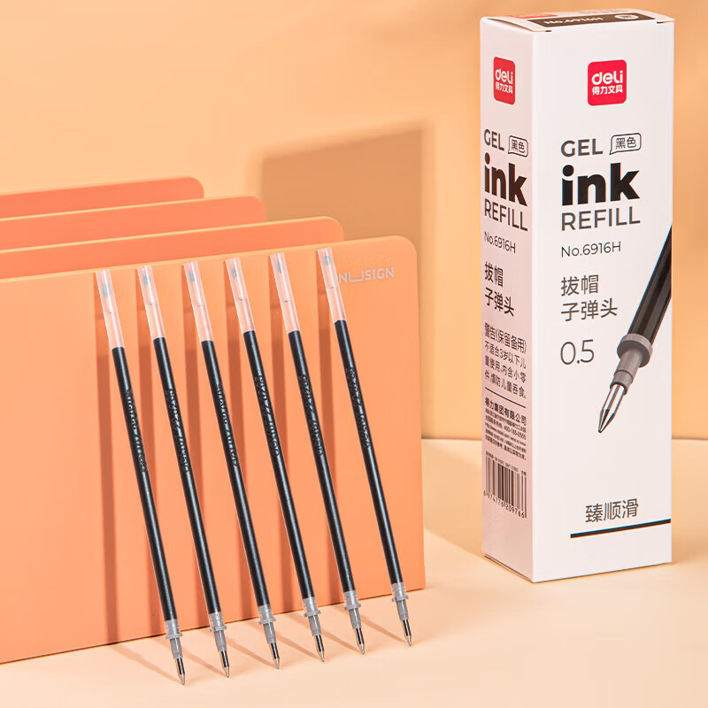 自营 得力(deli)【顺滑之星】臻顺滑中性笔替芯 速干 办公学生水笔签字笔替芯 0.5mm拔帽子弹头黑色20支/盒6916H¥15.37热销中