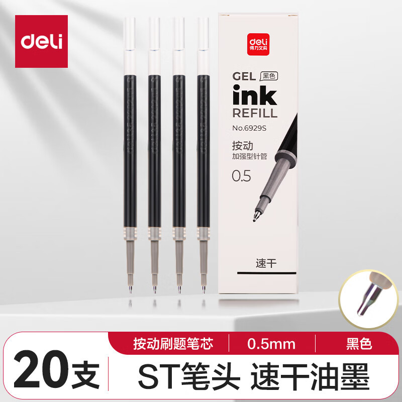 自营 得力(deli)【抗摔小金刚】速干中性笔 替芯0.5mm按动加强型针管黑色20支/盒6929S¥20.62热销中