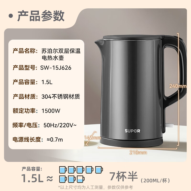 自营 苏泊尔 双层电水壶 1.5升 SW-15S02A¥150.00热销中