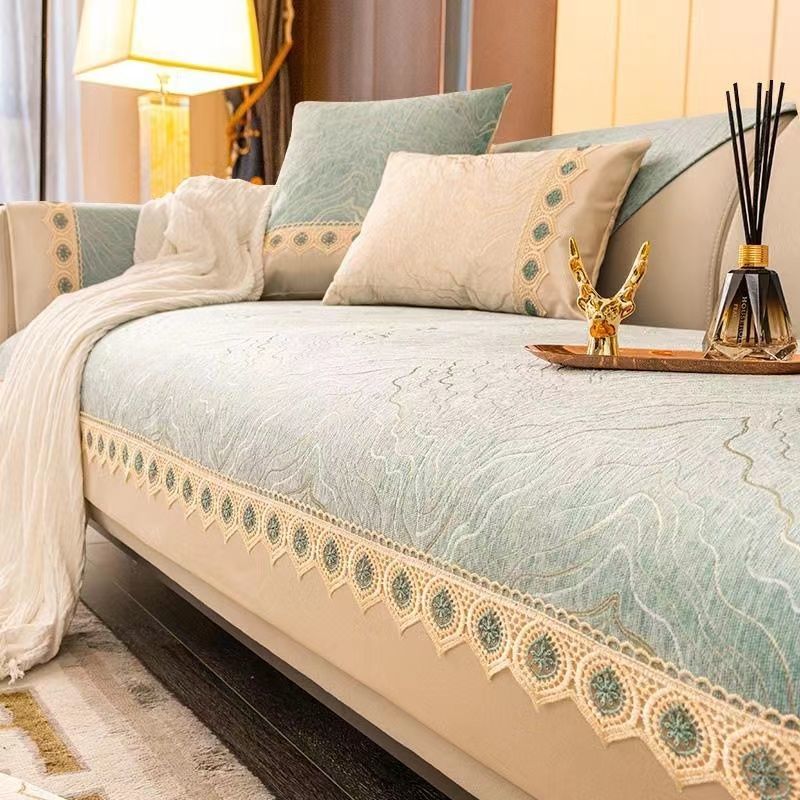 新中式雪尼尔面料沙发垫四季通用纯色祥云织带防滑萬能沙发盖巾罩_53 70*180cm 宝蓝¥99.32热销中 -