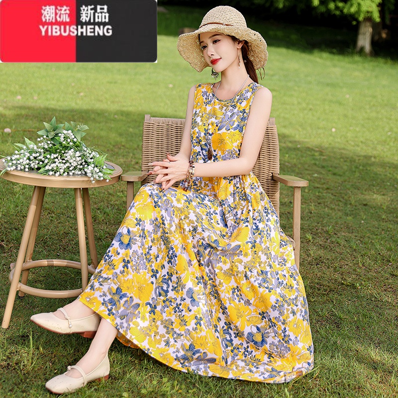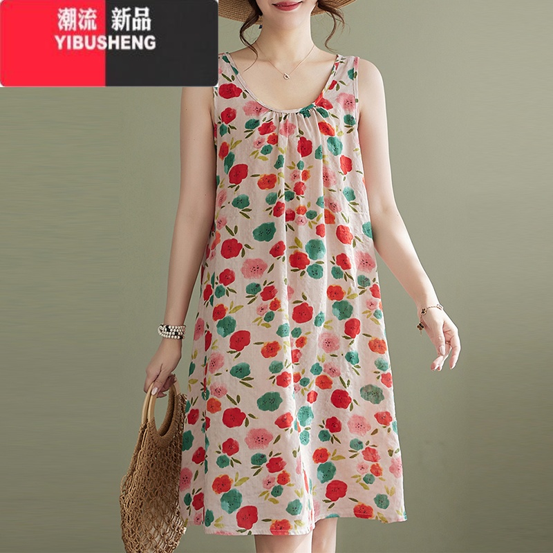 YIBUSHENG2024款宽松吊带a字裙遮肚显瘦棉麻无袖背心裙圆领碎花连衣裙女 9917花色 M建议95-115斤¥54.00热销中 -