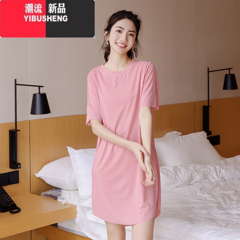 YIBUSHENG季薄款宽松中长裙冰丝连衣裙短袖女打底裙纯色圆领家居睡裙大码 冰丝裙粉色 XL建议120-140斤¥25.00热销中 -