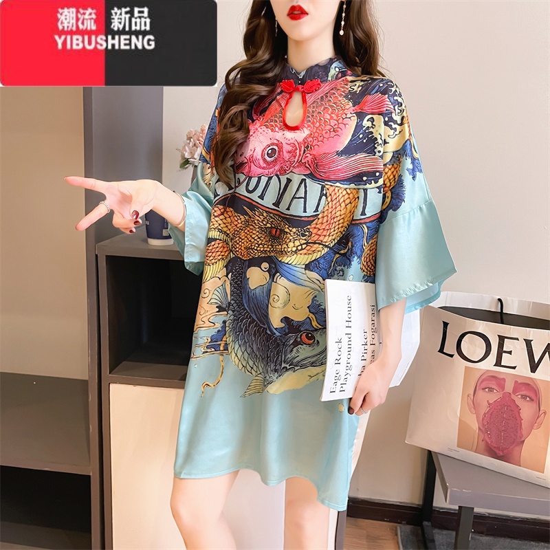 YIBUSHENG时尚中国风改良旗袍连衣裙女季大码宽松设计感小众洋气裙子 4138蓝色 XL适合130-150斤¥70.00热销中 -