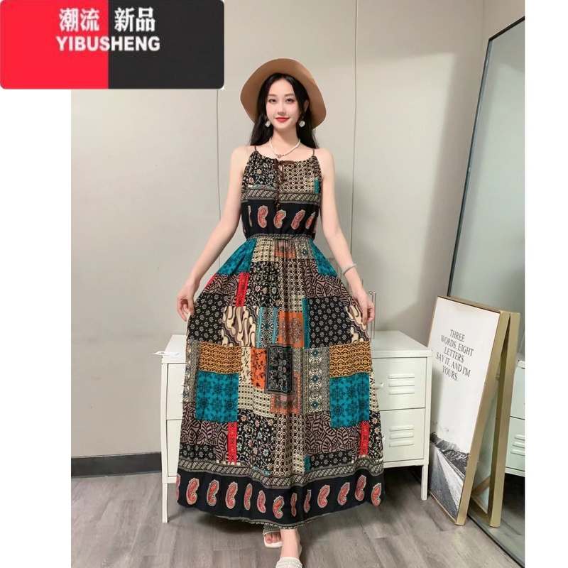 YIBUSHENG波西米亚沙滩裙吊带裙连衣裙海边度假棉绸碎花长裙甜美印花无袖 方块黑 均码建议80-135斤¥72.00热销中 -