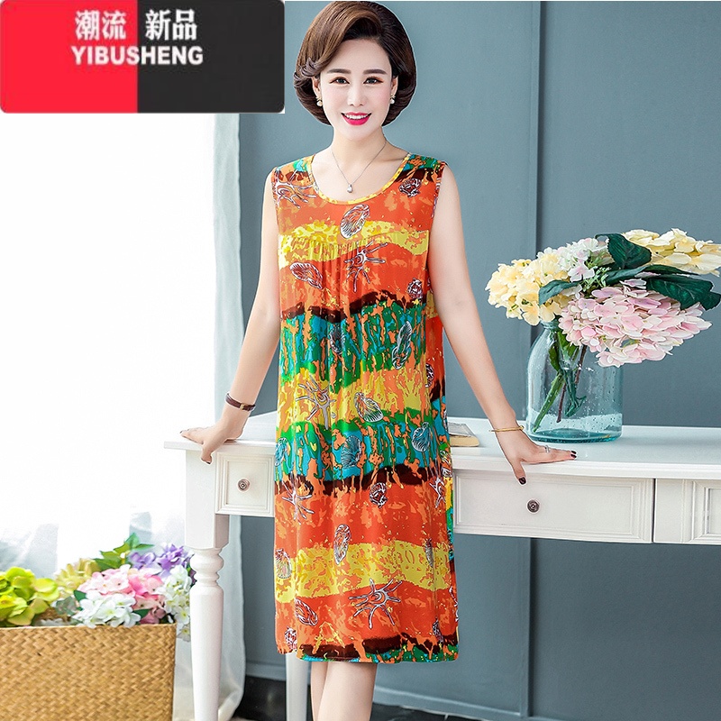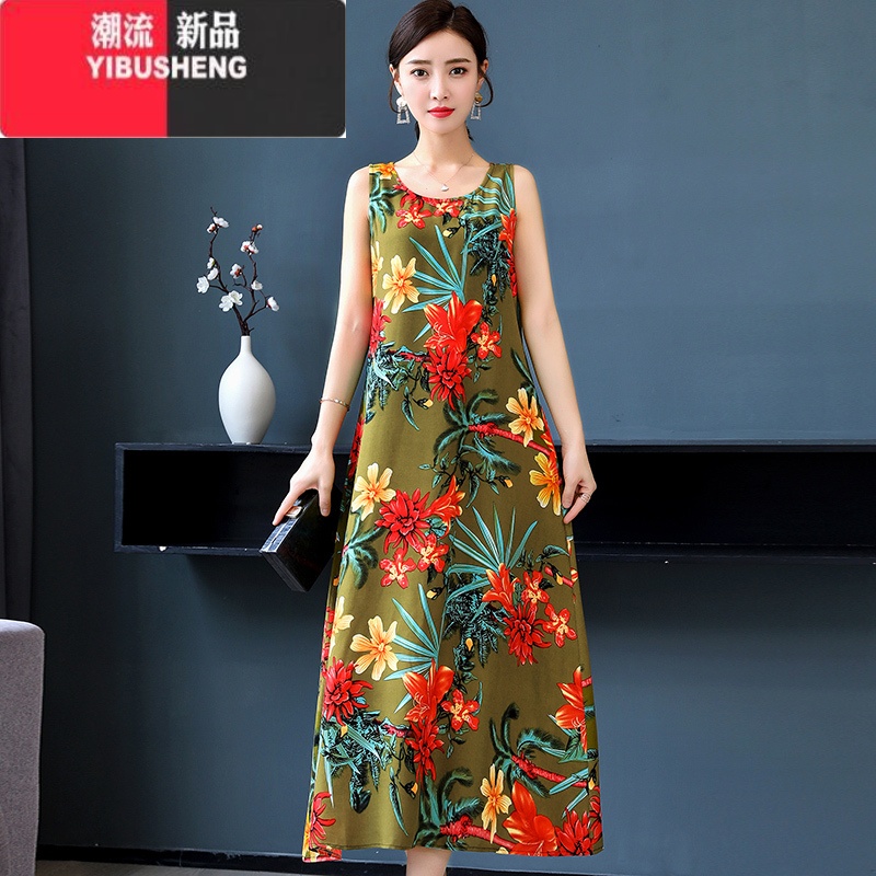 YIBUSHENG中年妈妈装棉绸连衣裙女装无袖中长款宽松大码显瘦沙滩大摆裙子 8号色 XL建议90-115斤穿¥43.00热销中 -