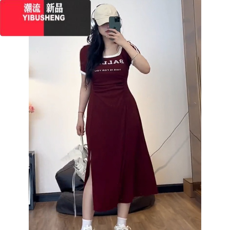 YIBUSHENG大码女装法式纯欲风U领连衣裙女季微胖mm显瘦遮肚子运动风短裙 酒红色长裙 2XL码建议140-160斤¥162.00热销中 -