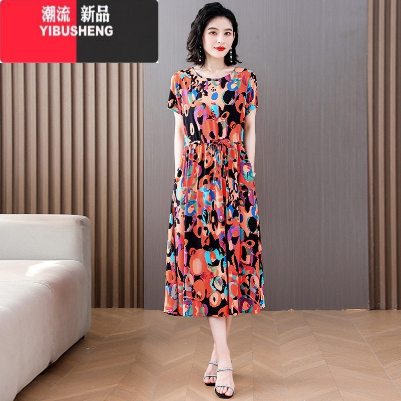 YIBUSHENG2024季时尚大气圆领中长款大码中老年女装冰丝妈妈装薄款连衣裙 7004#红色 M建议100斤以下¥36.00热销中 -