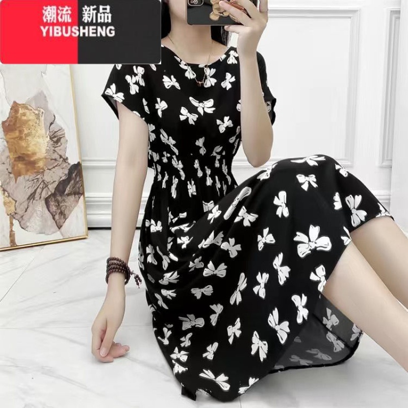 YIBUSHENG季民族风棉绸碎花连衣裙海边度假人造棉仙女裙大码印花中长裙子 5黑底蝴蝶结 XL120-135斤¥74.00热销中 -