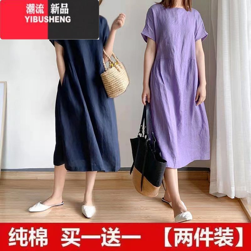 YIBUSHENG韩版简约文艺女2023季连衣裙纯色棉麻显瘦宽松大码中长款裙子女 藏青色+紫色 XL约115-130斤¥77.00热销中 -