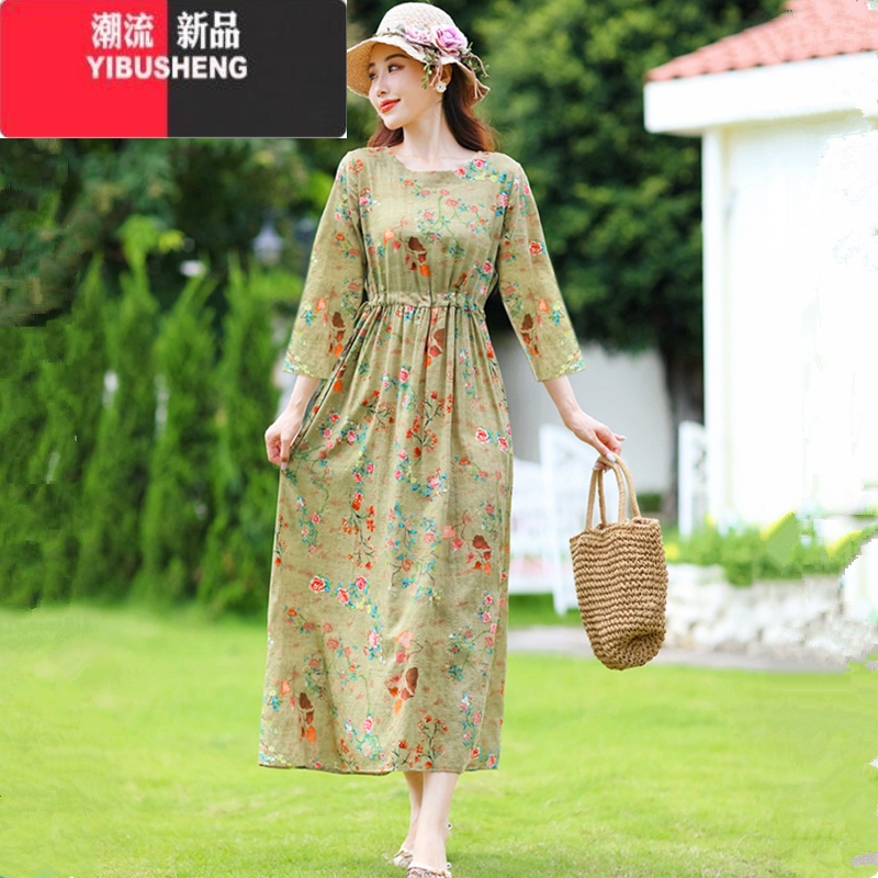 YIBUSHENG复古文艺碎花棉麻连衣裙女季宽松显瘦抽绳收腰时尚休闲长裙 抹茶绿七分袖 M建议95-115斤¥124.00热销中 -