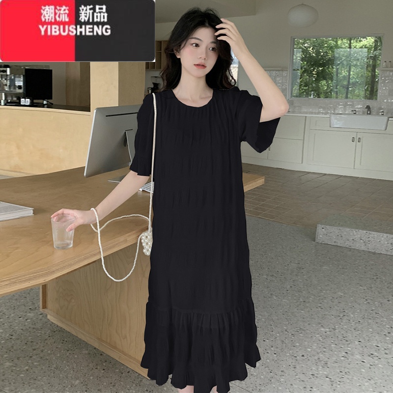 YIBUSHENG法式设计感短袖雪纺连衣裙女季2024新款小个子大码宽松显瘦长裙 黑色 L¥142.00热销中 -