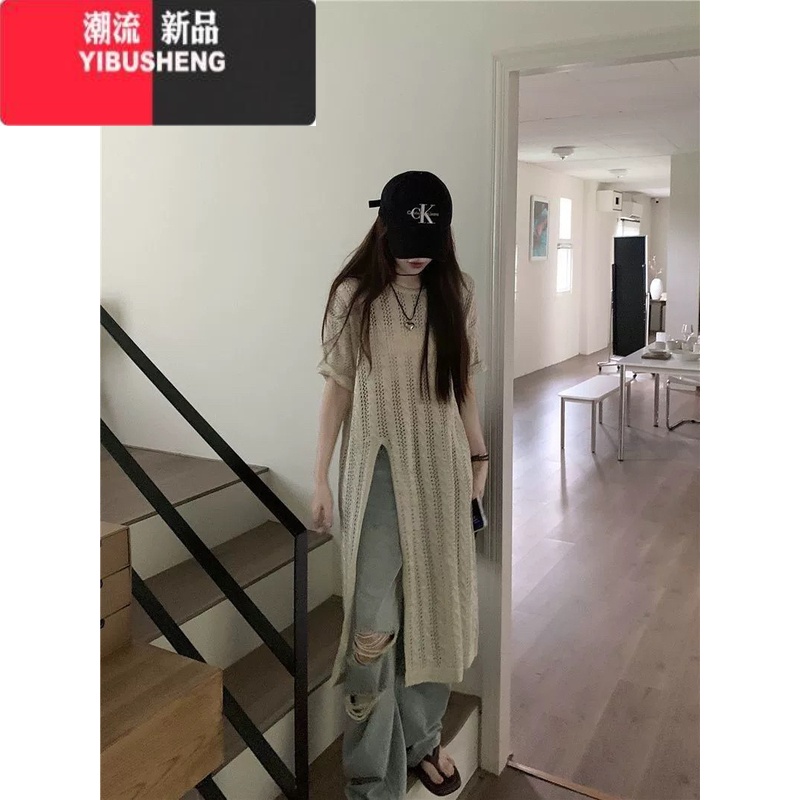 YIBUSHENG季短袖镂空气质连衣裙女设计感开衩中长款过膝裙薄款罩衫针织衫 杏色 S¥70.00热销中 -