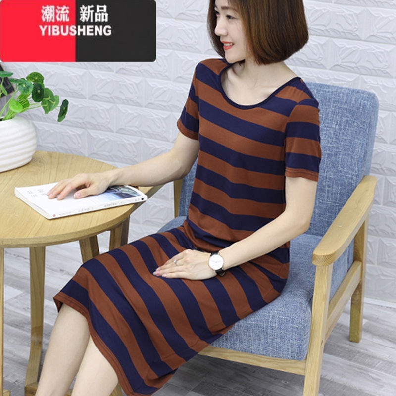 YIBUSHENG条纹休闲短袖长款连衣裙女季新款韩版宽松加大码打底裙女 224-棕色 XL建议110-120斤¥59.00热销中 -