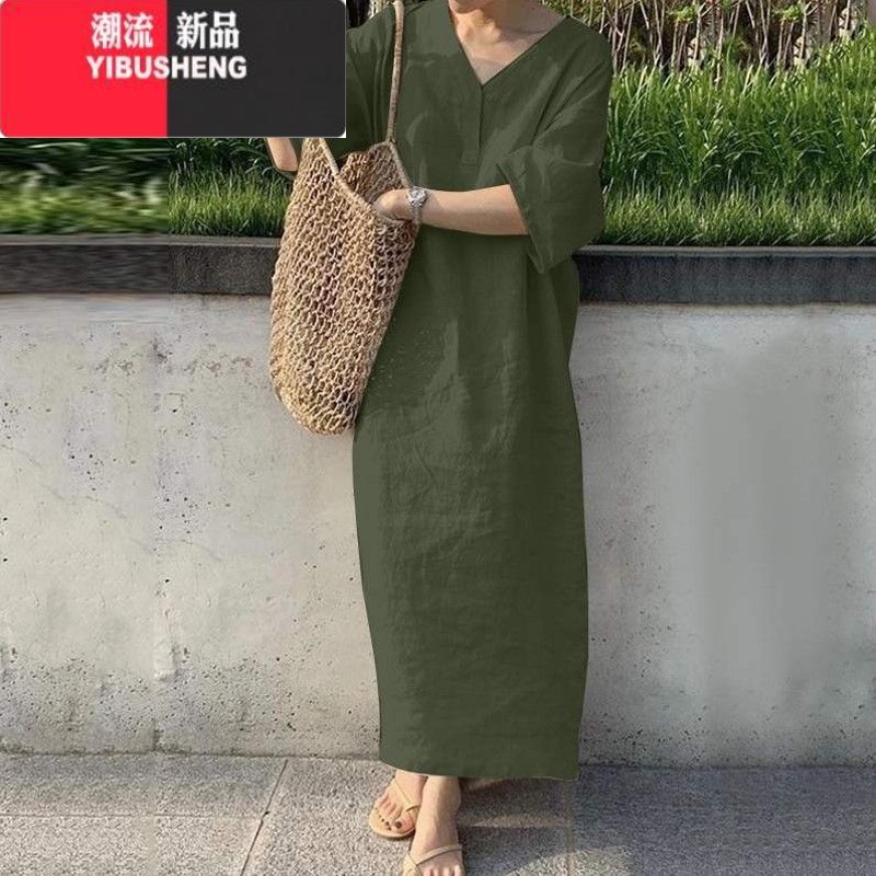YIBUSHENG2024季休闲亚麻连衣裙宽松文艺大码遮肚显瘦五分袖季开叉长裙 军绿色现量少货 5XL建议180-200斤¥88.00热销中 -