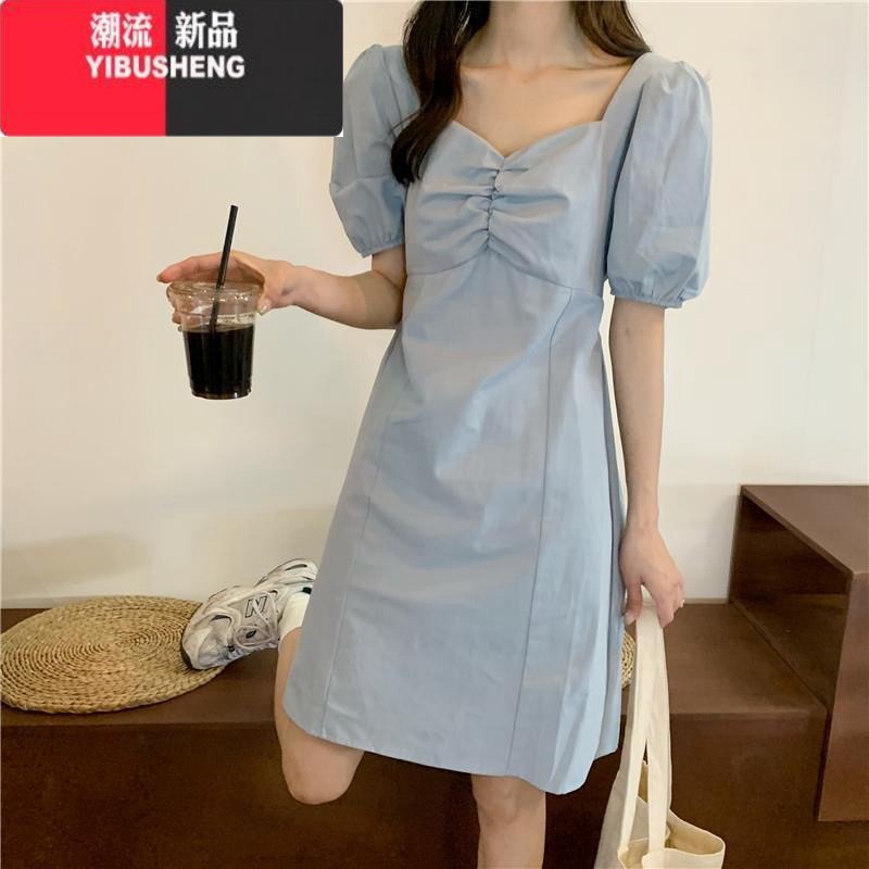 YIBUSHENG法式复古气质方领泡泡袖连衣裙女新款温柔风收腰显瘦a字短裙子 蓝色清爽兰短袖 M建议90-105斤¥48.00热销中 -