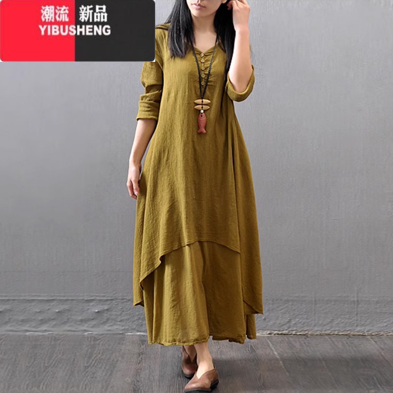 YIBUSHENG新款民族风优质假两件长裙春秋大摆亚麻连衣裙宽松长袖棉麻裙 姜黄色 3XL建议125-135斤¥51.00热销中 -