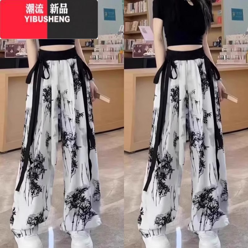 YIBUSHENG季新款大码休闲裤女质感黑白印花飘带薄款冰丝雪纺高腰阔腿裤腿 M推荐80-100斤 黑白花¥72.00热销中 -