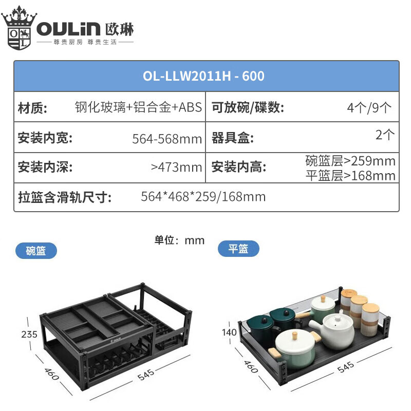 欧琳拉篮2011系抽屉式碗篮半抽三层不沾油厨房碗碟双层拉篮钢化玻璃阻尼导轨不锈钢 2011系【600柜体外径】¥909.00热销中 -