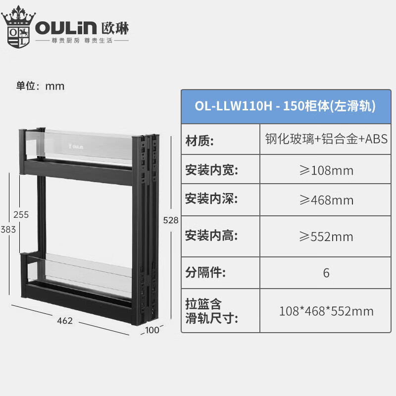 欧琳拉篮厨房调味篮110H极窄柜调料收纳拉篮夹缝篮铝合金不沾油枪灰色阻尼轨道不锈钢 柜体外径>=150mm左轨道¥389.00热销中 -