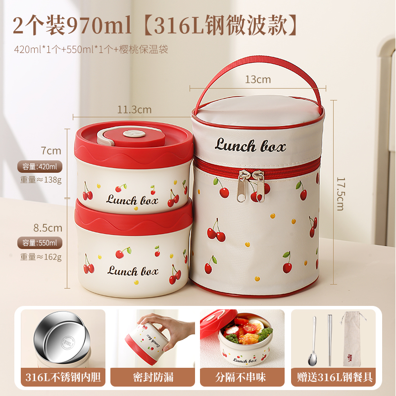 樱桃便当盒 2个装970ml(1大1小)送316L勺筷+保温提包¥69.00热销中