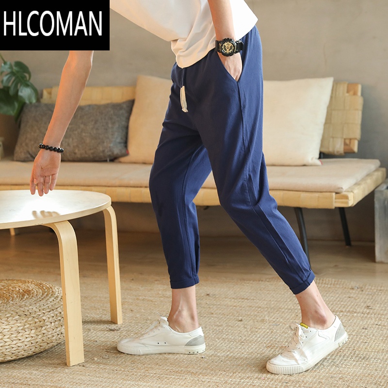 HLCOMAN九分棉麻裤男士夏季薄款韩版潮流宽松休闲裤小脚八分哈伦裤男裤子 M K35藏青色单件装¥50.00热销中