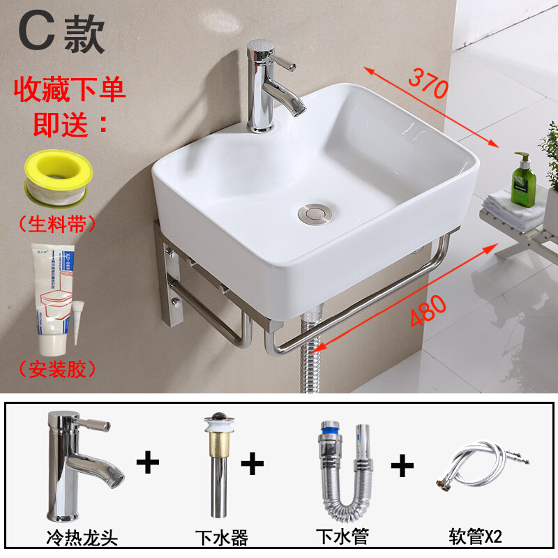 新款简易支架盆挂墙式盆陶瓷洗手盆小户型洗脸盆面盆卫生间阳台挂盆镀银盆48长+304置物支架_2 460+一体下水+圆形龙头不含支架¥318.00热销中