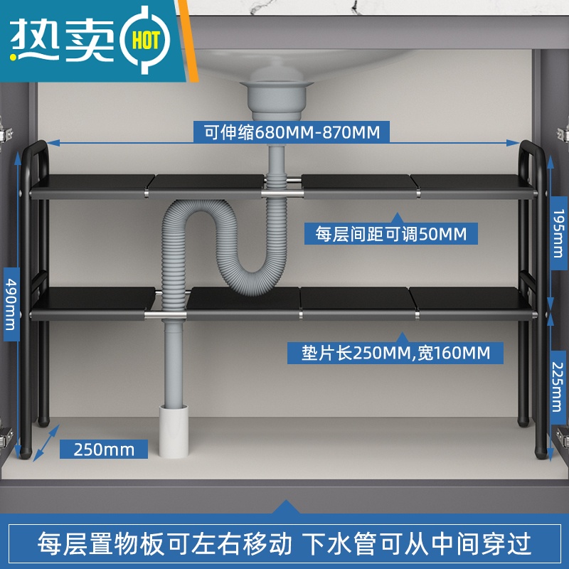 XIANCAI伸缩浴室橱柜内分层收纳洗漱洗手台下整理架子 烤漆黑双层【长度可伸缩】送8块板¥176.00热销中