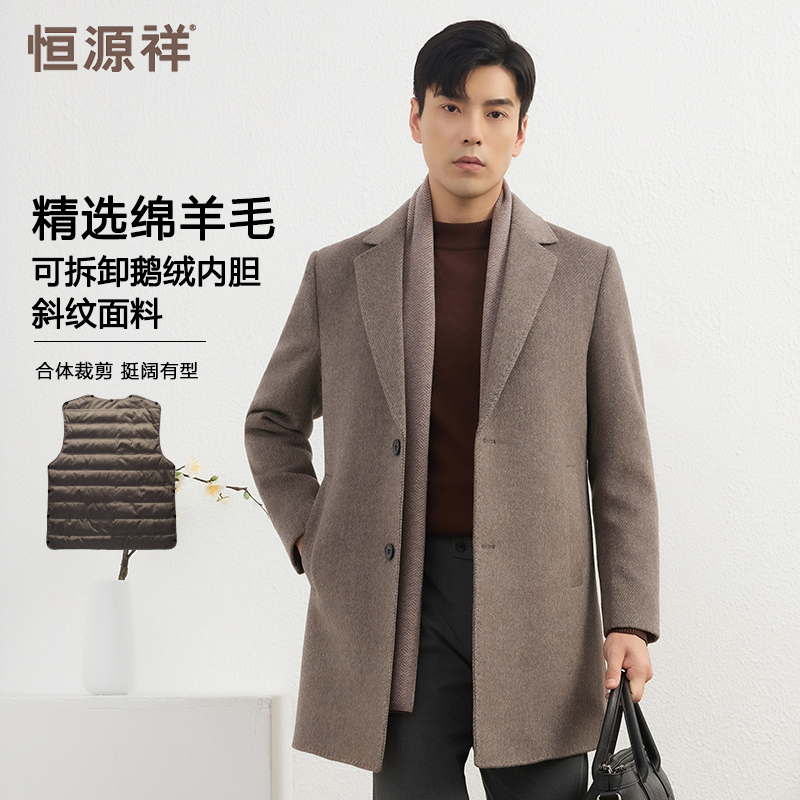 恒源祥2024秋冬鹅绒内胆双面呢大衣男斜纹羊毛呢子风衣外套中长款 190/104A 卡其色¥1476.00热销中
