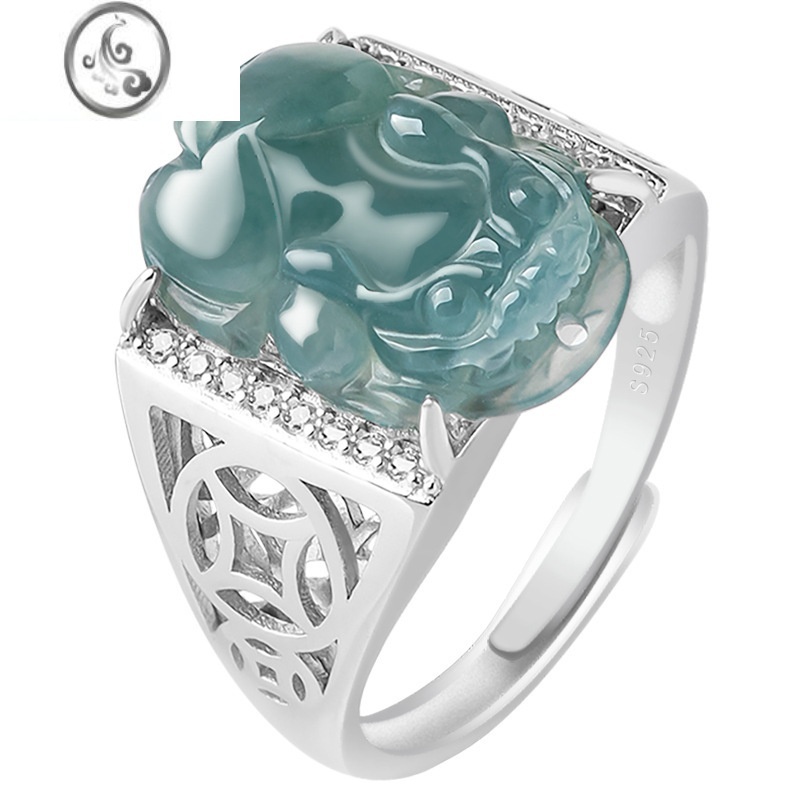 JiMis925银镶嵌银a货翡翠蓝水貔貅玉石男女款可调节情侣时尚戒玉 蓝水貔貅戒指男款¥394.00热销中
