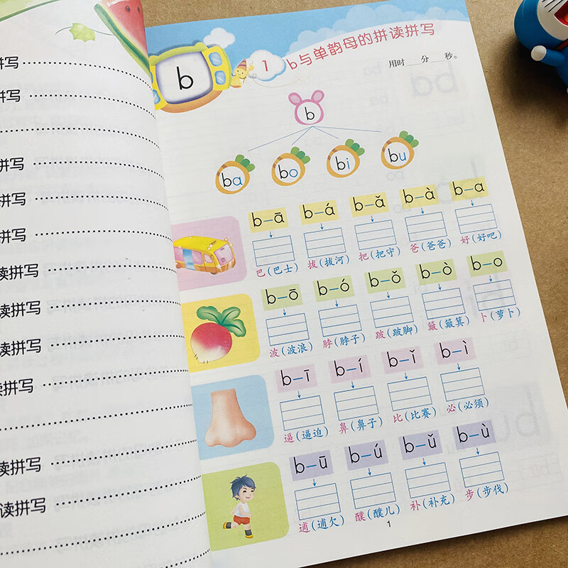 单韵母声母四声调拼音拼读训练带汉字拼读拼写拼音教材字母表拼音学习神器幼儿园升小学一年级拼音四声调练习 声母+单韵母拼音训¥29.00热销中 -
