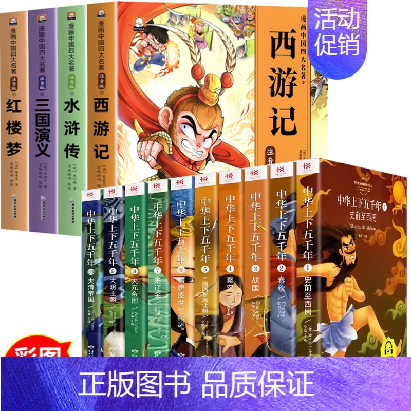 【全14册彩图注音版】四大名著连环画+中华上下五千年 【正版】漫画中国四大名著连环画全套4册小学生一年级二年级阅读课外书
